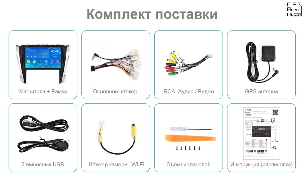 - В комплекте переходная рамка, кабель питания и звука (разъем Toyota), RCA (линейные выхода и входа), штекер для камеры заднего вида, 2 кабеля USB, универсальные крепления, GPS антенна, инструкция-распиновка подключения на русском языке.